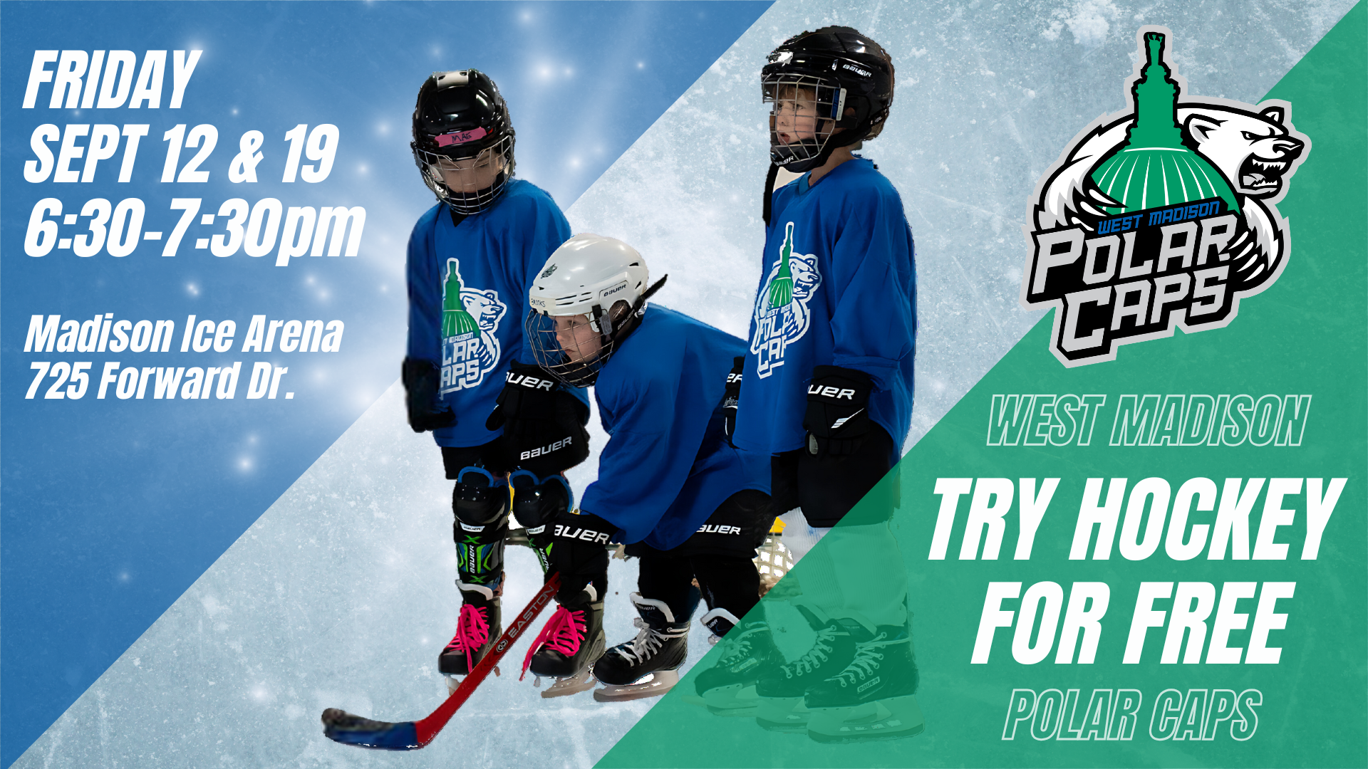 The West Madison Polar Caps are hosting FREE Try Hockey events at Madison Ice Arena on September 12th and September 19th from 6:30-7:30pm. Come out to the rink and give it a try! We will provide the gear and get your skater out and moving on the ice with Polar Caps coaches. Please plan to stay with your skater for the duration of the event.